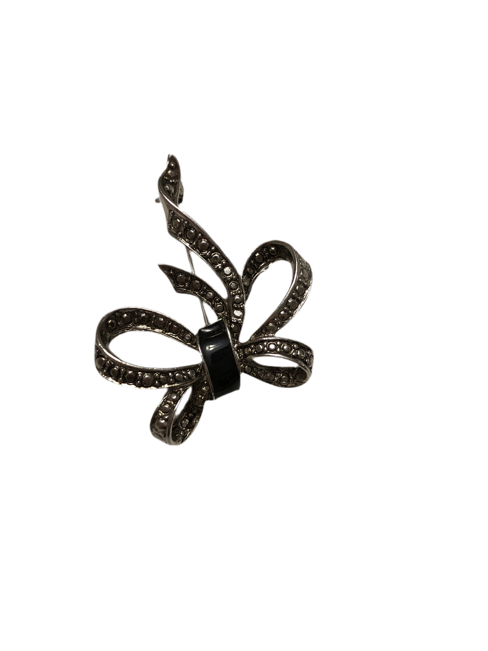 Broche élégante en forme de nœud, réalisée en métal argenté travaillé et ornée de petites incrustations scintillantes.