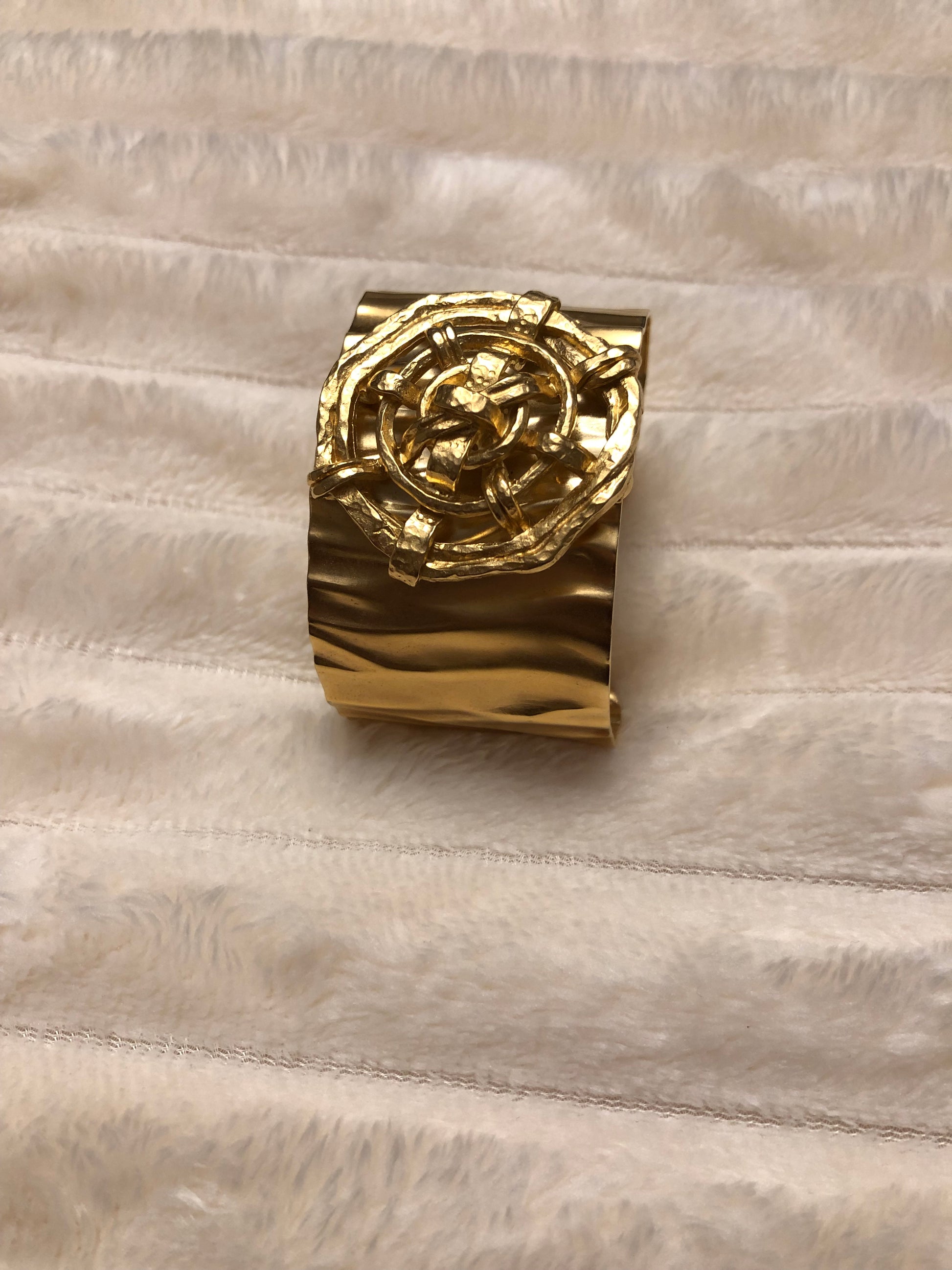 Manchette dorée au design unique et texturé, orné d’un motif central sculptural.
